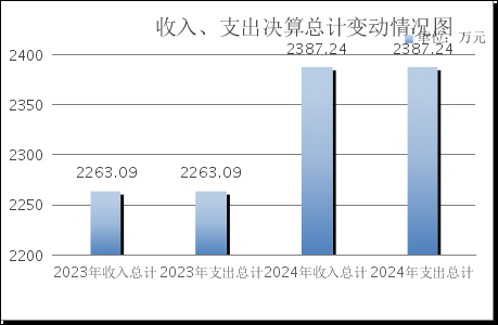 2024年度收入总计为2387.24万元,支出总计为2387.24万元。与2023年度相比,收入总计增加124.15万元,增加5.49%;支出总计增加124.15万元,增加5.49%。主要变动原因是人员增加导致人员经费增加。