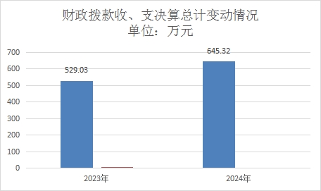 2024年度财政拨款收入、支出总计均为645.32万元。与2023年度相比,财政拨款收入总计、支出总计各增加116.29万元,增长21.98%。主要变动原因是原鸭池卫生院因撤乡并镇财务账目合并。