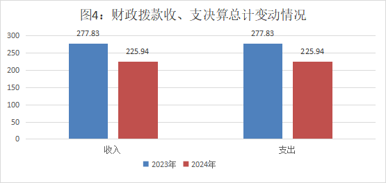 2024年度财政拨款收入、支出总计均为225.94万元。与2023年度相比,财政拨款收入总计、支出总计各减少51.89万元,下降18.68%。主要变动原因是2024年度财政拨款收入减少。