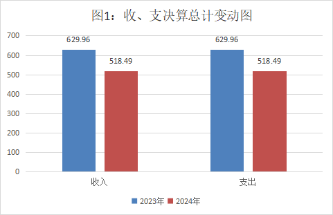 2024年度收入、支出总计均为518.49万元。与2023年度相比,收入、支出总计各减少111.47万元,下降17.69%。主要变动原因是2024年度事业收入、财政拨款收入减少。