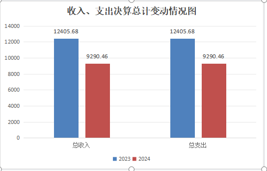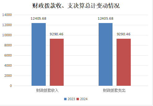 2024年度财政拨款收入、支出总计均为9290.46万元。与2023年度相比,财政拨款收入总计、支出总计各减少3115.22万元,下降25.11%。主要变动原因是卫生健康支出减少、社会保障和就业支出减少。