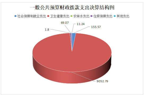 2024年度一般公共预算财政拨款支出9290.46万元,主要用于以下方面:社会保障和就业支出155.57万元,占1.67%;卫生健康支出9052.79万元,占97.44%;农林水支出1.80万元,占0.02%;住房保障支出69.07万元,占0.74%;其他支出11.24万元,占0.12%。