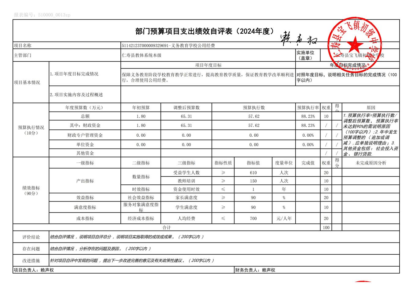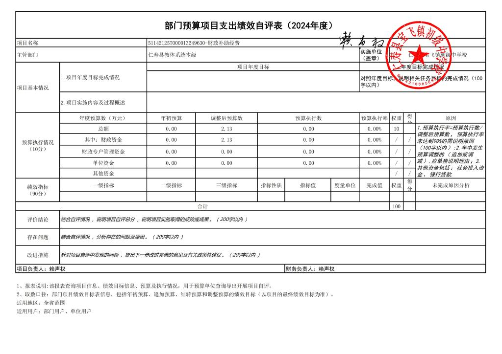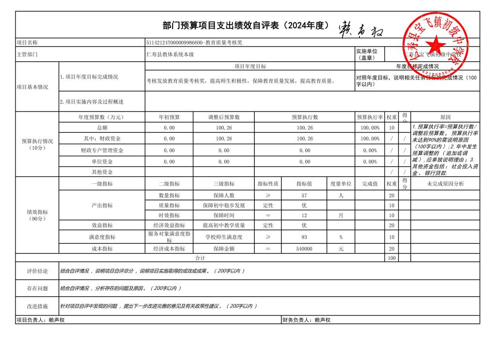根据预算绩效管理要求,仁寿县宝飞镇初级中学校在2024年度预算编制阶段,组织对“义务教育学校公用经费”“教育质量考核奖”“财政补助经费”3个项目开展了预算事前绩效评估,对3个项目编制了绩效目标;预算执行过程中,对3个项目开展绩效监控;年终执行完毕后,组织对3个项目开展绩效自评,未形成专项预算项目绩效自评报告,3个部门预算项目绩效自评表,《部门预算项目支出绩效自评表(2024年度)》见附件1(第四部分)。