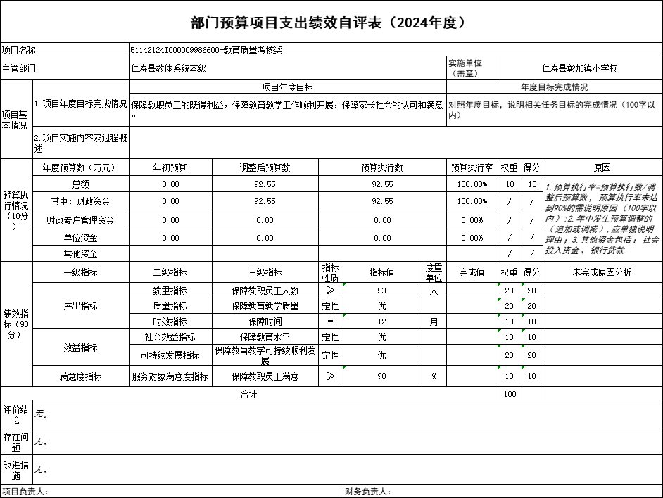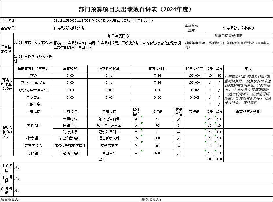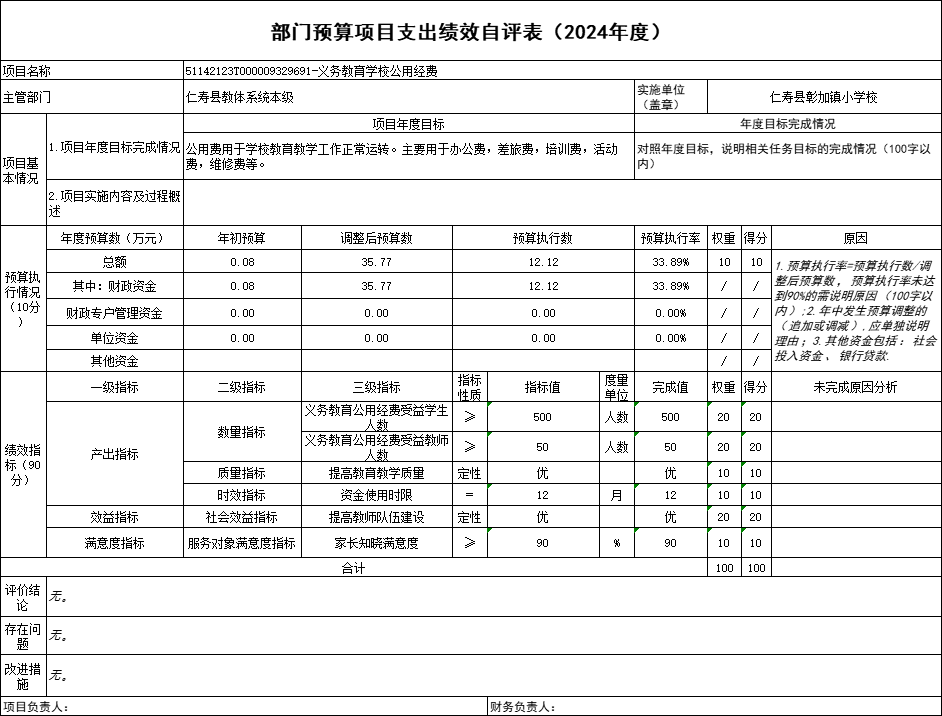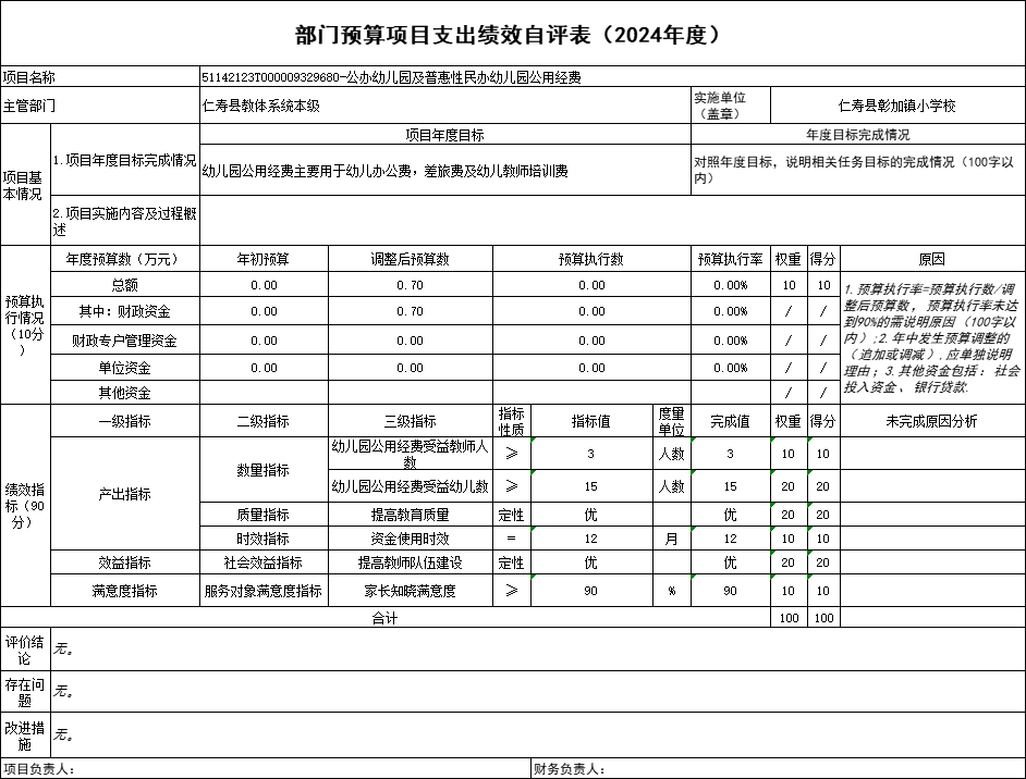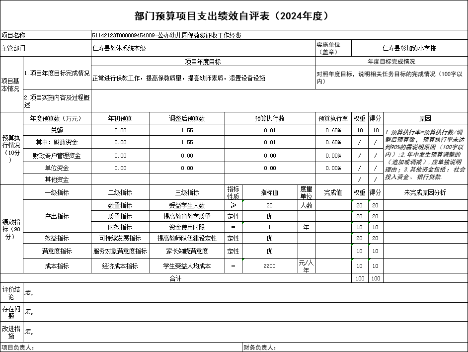 根据预算绩效管理要求,仁寿县彰加镇小学校在2024年度预算编制阶段,组织对“公办幼儿园及普惠性民办幼儿园公用经费”“义务教育学校公用经费”“公办幼儿园保教费征收工作经费”“教育质量考核奖”“义教均衡达标维修改造项目(二标段))”等5个项目开展了预算事前绩效评估,对5个项目编制了绩效目标;预算执行过程中,对5个项目开展绩效监控;年终执行完毕后,组织对5个项目开展绩效自评,未形成专项预算项目绩效自评报告,5个部门预算项目绩效自评表,《部门预算项目支出绩效自评表(2024年度)》见附件1(第四部分)。