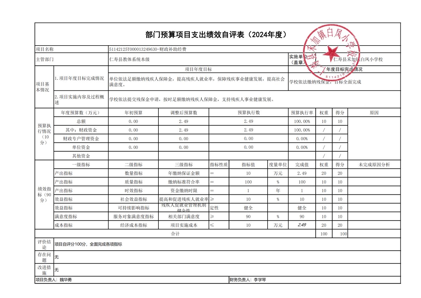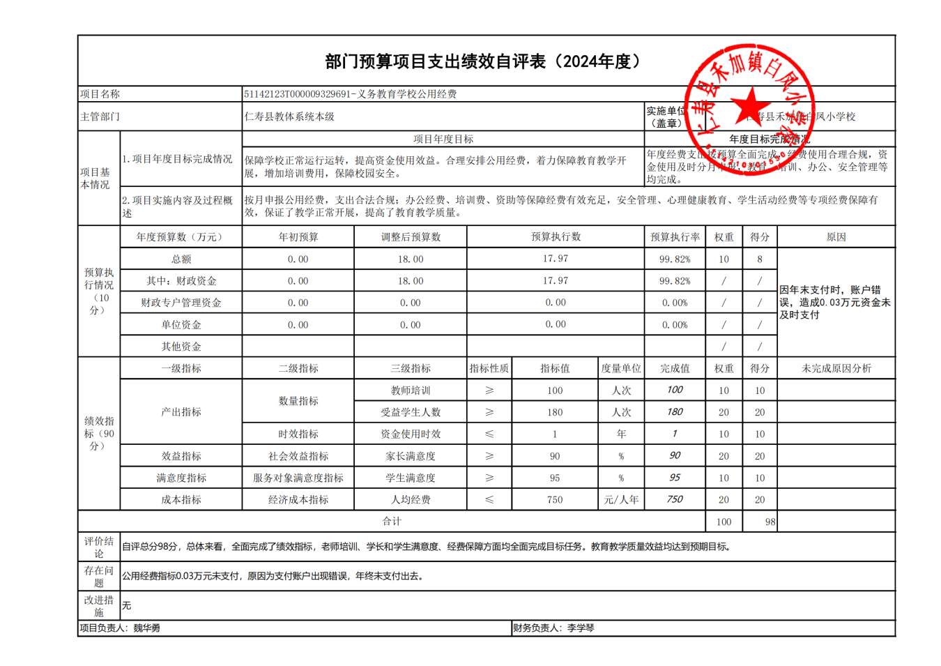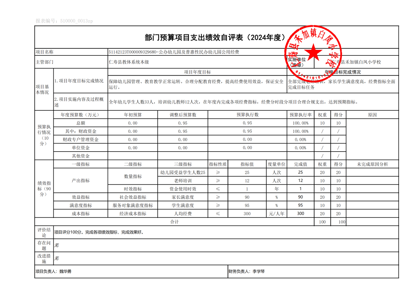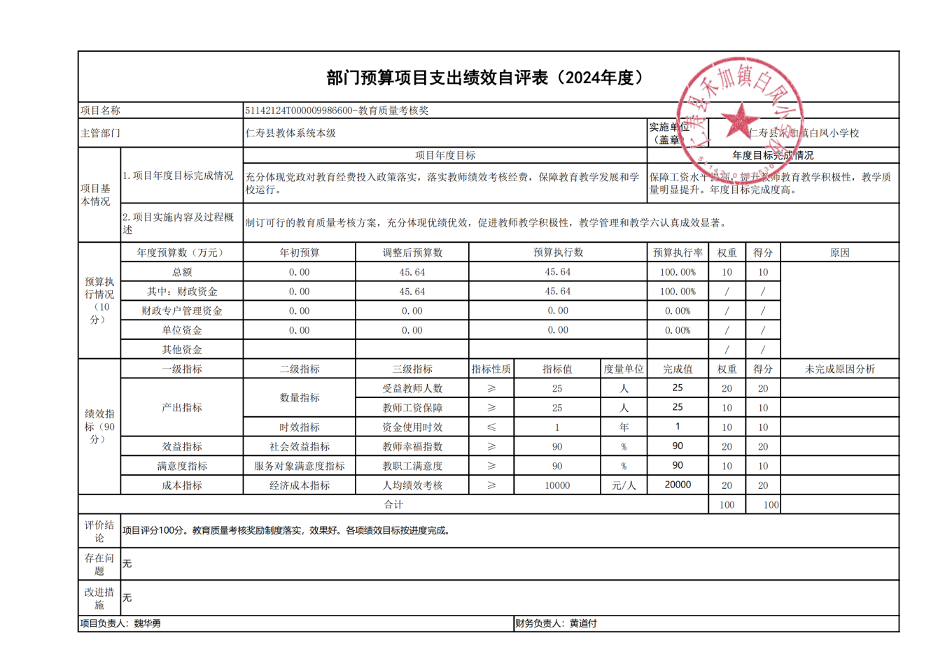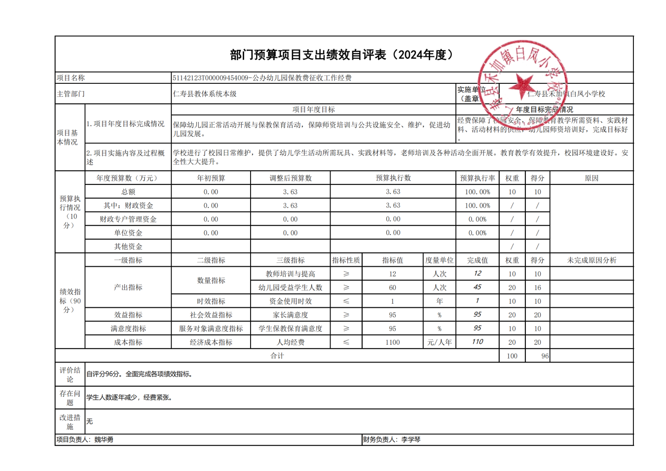 根据预算绩效管理要求,仁寿县禾加镇白凤小学校在2024年度预算编制阶段,组织对“财政补助经费”“公办幼儿园保教费征收工作经费”“公办幼儿园及普惠性民办幼儿园公用经费”“教育质量考核奖”“义务教育学校公用经费”5个项目开展了预算事前绩效评估,对5个项目编制了绩效目标;预算执行过程中,对5个项目开展绩效监控;年终执行完毕后,组织对5个项目开展绩效自评,未形成专项预算项目绩效自评报告,5个部门预算项目绩效自评表,《部门预算项目支出绩效自评表(2024年度)》见附件1(第四部分)。
