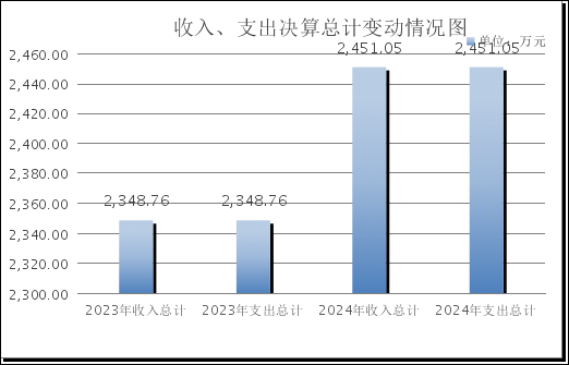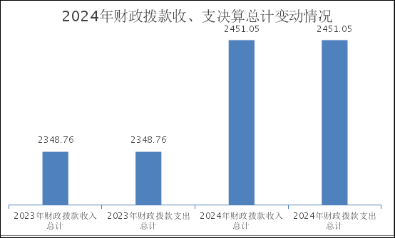 2024年度财政拨款收入、支出总计均为2451.05万元。与2023年度相比,收入总计增加102.29万元,增长4.36%,支出总计增加102.29万元,增长4.36%,主要变动原因是当年项目收入增加。