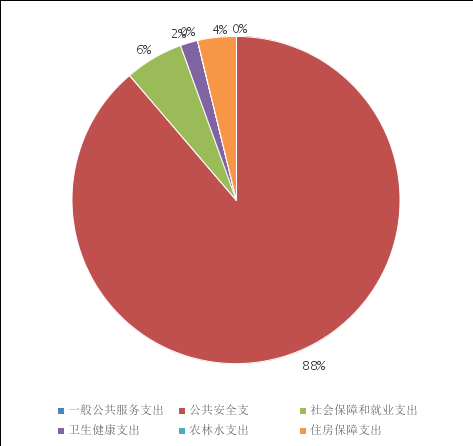 2024年度一般公共预算财政拨款支出22,137.38万元,主要用于以下方面:一般公共服务支出3.99万元,占0.02%;公共安全支出19,645.02万元,占88.74%;社会保障和就业支出1,271.45万元,占5.74%;卫生健康支出383.61万元,占1.73%;农林水支出1.30万元,占0.01%;住房保障支出831.99万元,占3.76%。