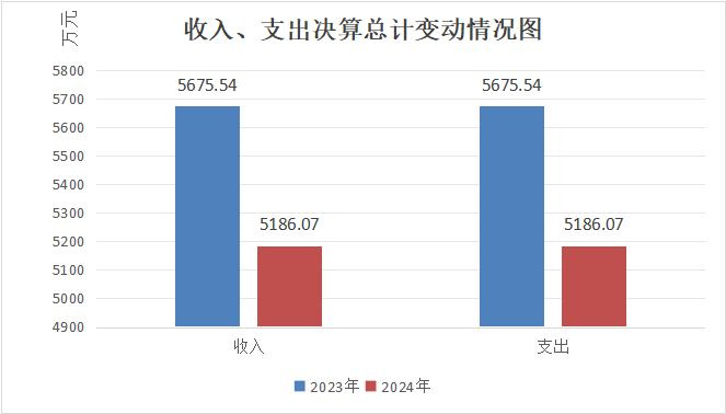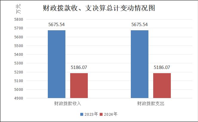 2024年度财政拨款收入、支出总计均为5186.07万元。与2023年度相比,财政拨款收入总计、支出总计各减少489.47万元,下降8.62%。主要变动原因是人员工资福利和项目经费支出减少。