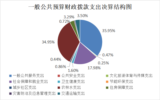2024年度一般公共预算财政拨款支出3925.21万元,主要用于以下方面:一般公共服务支出1407.69万元,占35.86%;公共安全支出9.92万元,占0.25%;文化旅游体育与传媒支出18.36万元,占0.47%;社会保障和就业支出705.56万元,占17.98%;卫生健康支出64.08万元,占1.63%;节能环保支出17.21万元,占0.44%;城乡社区支出33.68万元,占0.86%;农林水支出1373.73万元,占35%;交通运输支出137.39万元,占3.50%;住房保障支出129.25万元,占3.29%;灾害防治及应急管理支出28.34万元,占0.72%。