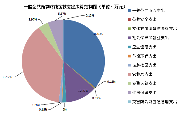 2024年度一般公共预算财政拨款支出4008.90万元,主要用于以下方面:一般公共服务支出1444.43万元,占36.03%,公共安全支出7.66万元,占0.19%,文化旅游体育与传媒支出12.93万元,占0.32%,社会保障和就业支出491.99万元,占12.27%,卫生健康支出62.88万元,占1.57%,节能环保支出6万元,占0.15%,城乡社区支出51.25万元,占1.28%,农林水支出1528.29万元,占38.12%,交通运输支出159.17万元,占3.97%,住房保障支出239.31万元,占5.97%,灾害防治及应急管理支出4.99万元,占0.12%。