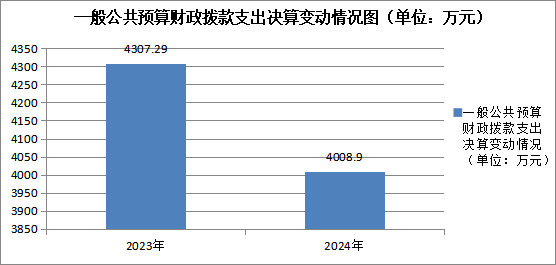 2024年度一般公共预算财政拨款支出4008.90万元,占本年支出合计的80.84%。与2023年度相比,一般公共预算财政拨款支出减少298.39万元,下降7.44%。主要变动原因是基础设施建设项目支出减少。