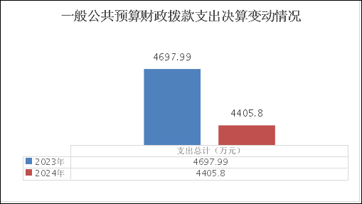 2024年度一般公共预算财政拨款支出4405.8万元,占本年支出合计的94.07%。与2023年度相比,一般公共预算财政拨款支出减少292.19万元,下降6.22%。主要变动原因是一般公共预算项目支出减少。