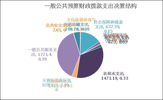 2024年度一般公共预算财政拨款支出4405.8万元,主要用于以下方面:一般公共服务支出1721.4万元,占39.07%;公共安全支出7.65万元,占0.17%;节能环保支出22.97万元,占0.52%;文化旅游体育与传媒支出16.24万元,占0.37%;社会保障和就业支出657.39万元,占14.92%;卫生健康支出76.76万元,占1.74%;住房保障支出151.23万元,占3.43%;城乡社区支出67.2万元,占1.53%;农林水支出1473.19万元,占33.44%;交通运输支出208.78万元,占4.74%;灾害防治及应急管理支出2.99万元,占0.07%。